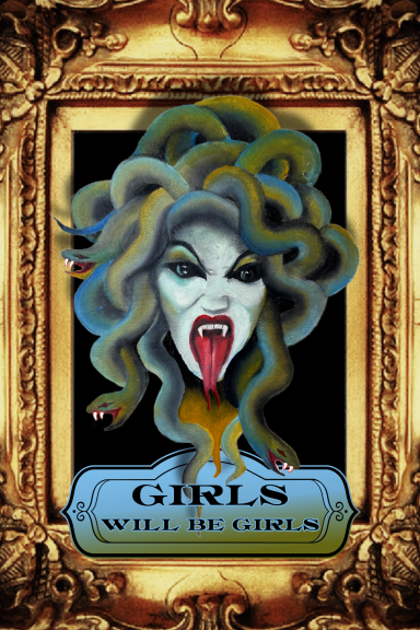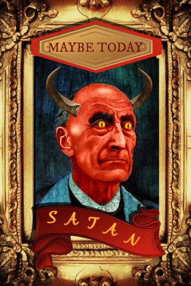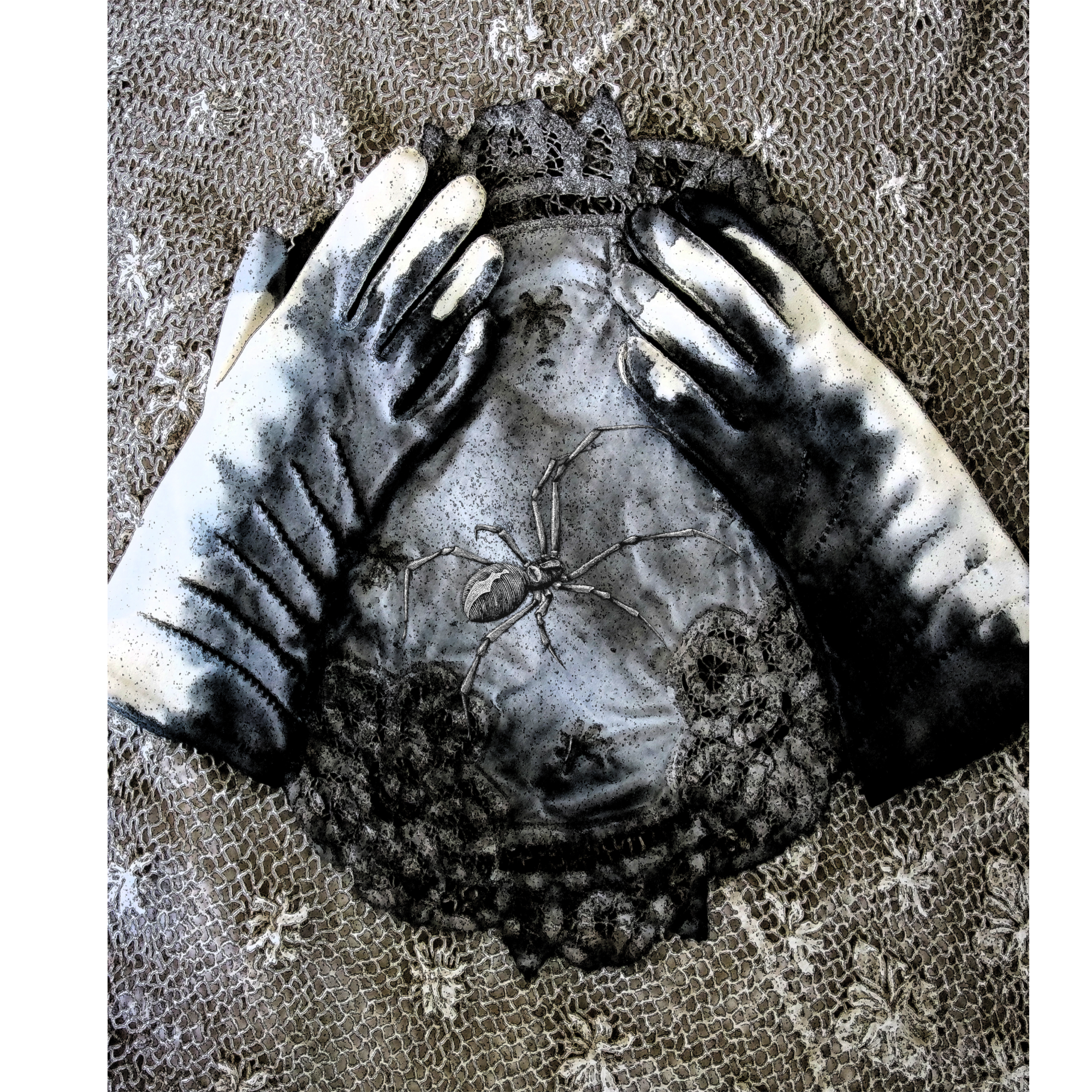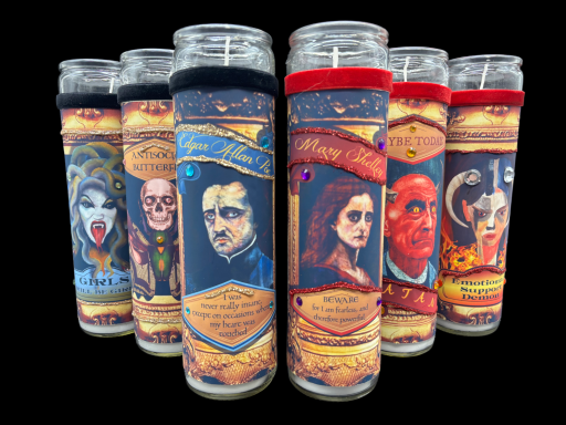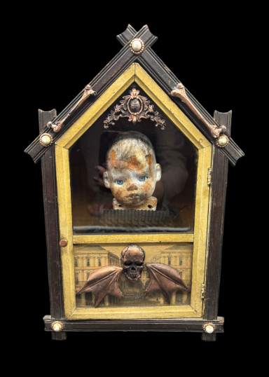 Embellished vintage crucifix, sculpted candle holders, candles, original photo collage, and sculpted head on gothic wooden tryptic.