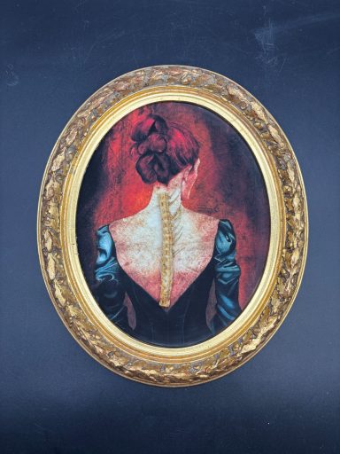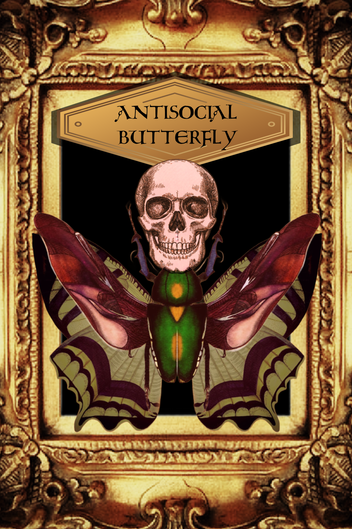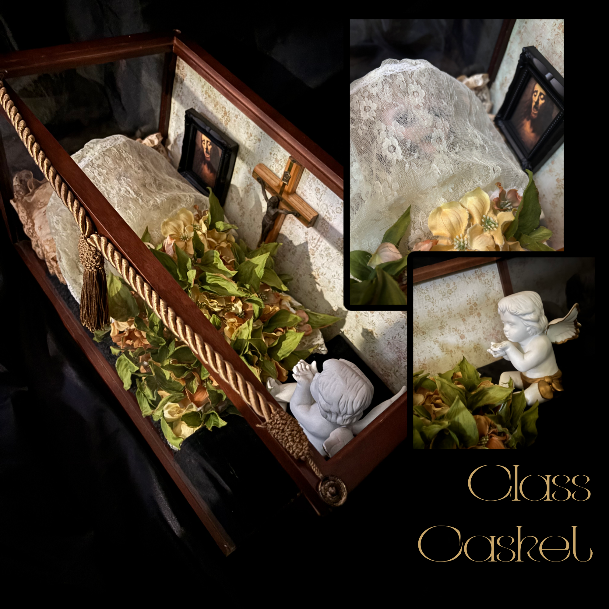 Casket cabinet with raven, black moss, hand painted butterfly print, green metallic egg, and framed spine (real bones). Deer antler inside