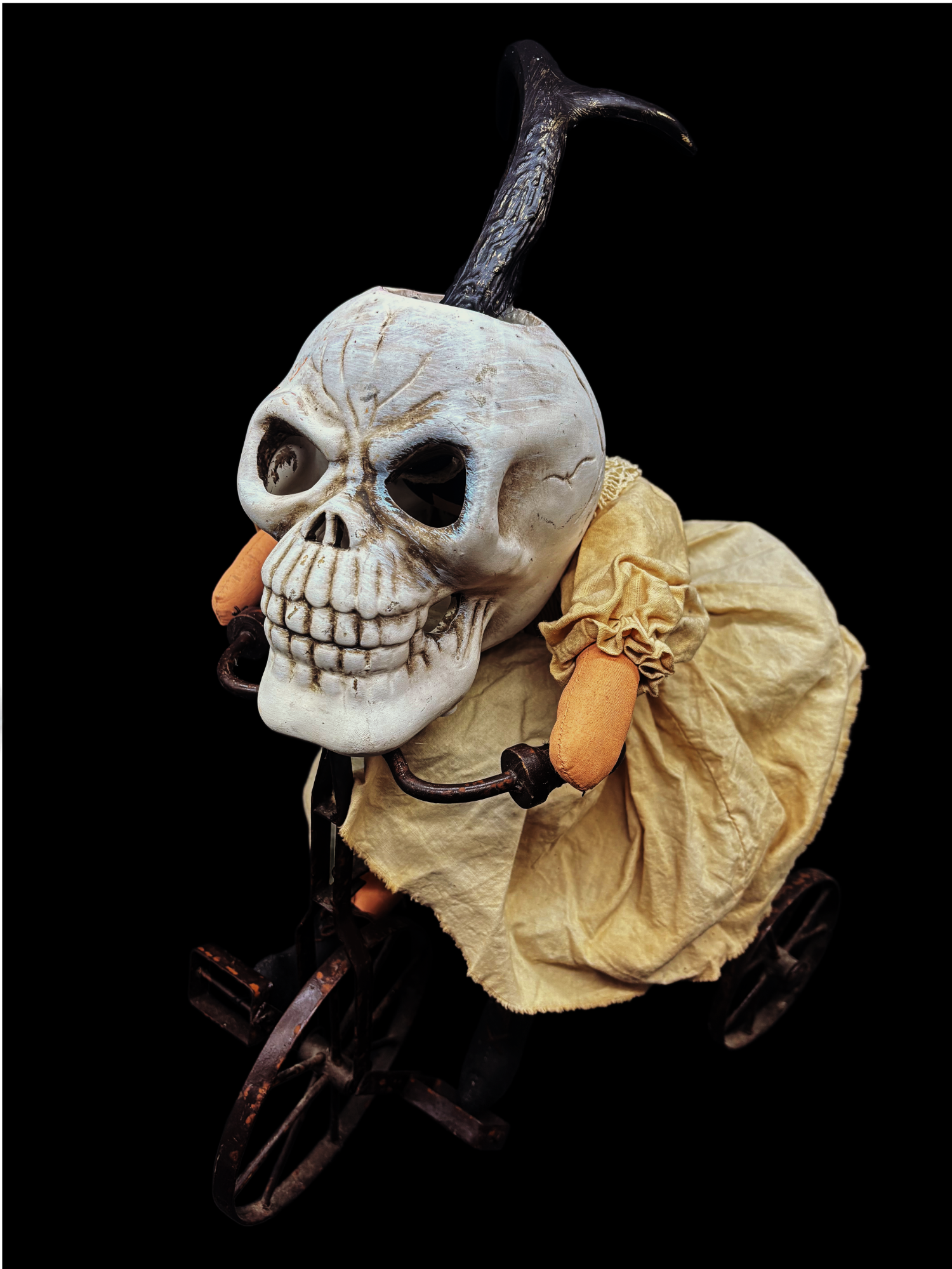 Skull planter, deconstructed Avon bottle, ethically sourced bones, faux flora, and pheasant feather.